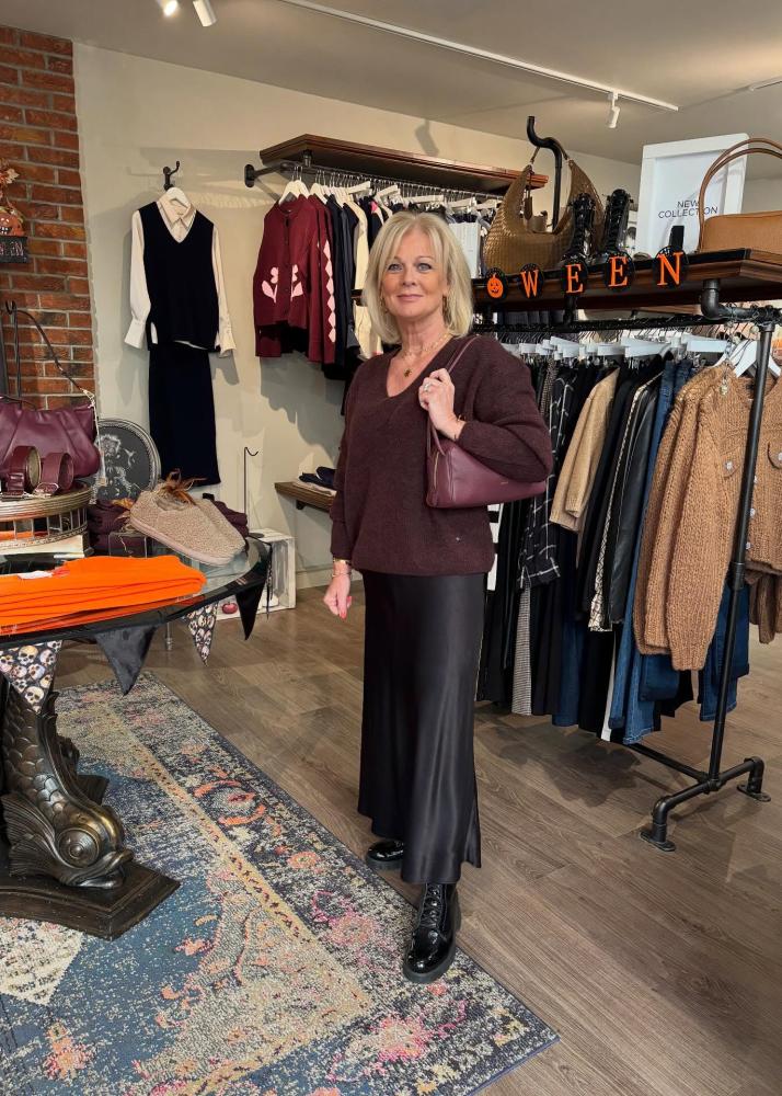 Today we have Jo wearing the black Rails skirt which is definitely a go to of hers and we have just re stocked in small medium and large, she wears it with the Thora knit in plum which is also available in other colours.