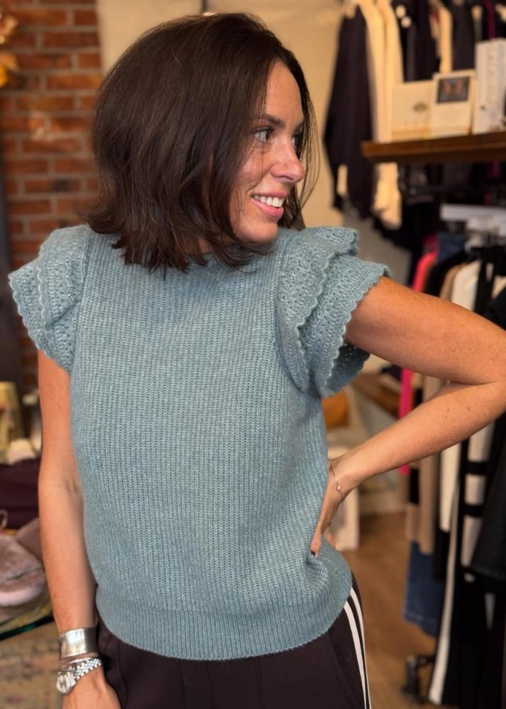 Charlotte styles hers with our Rails wool blend short-sleeve sweater, featuring a subtle ribbed texture, boxy fit, and tiered ruffle sleeves for a feminine touch.