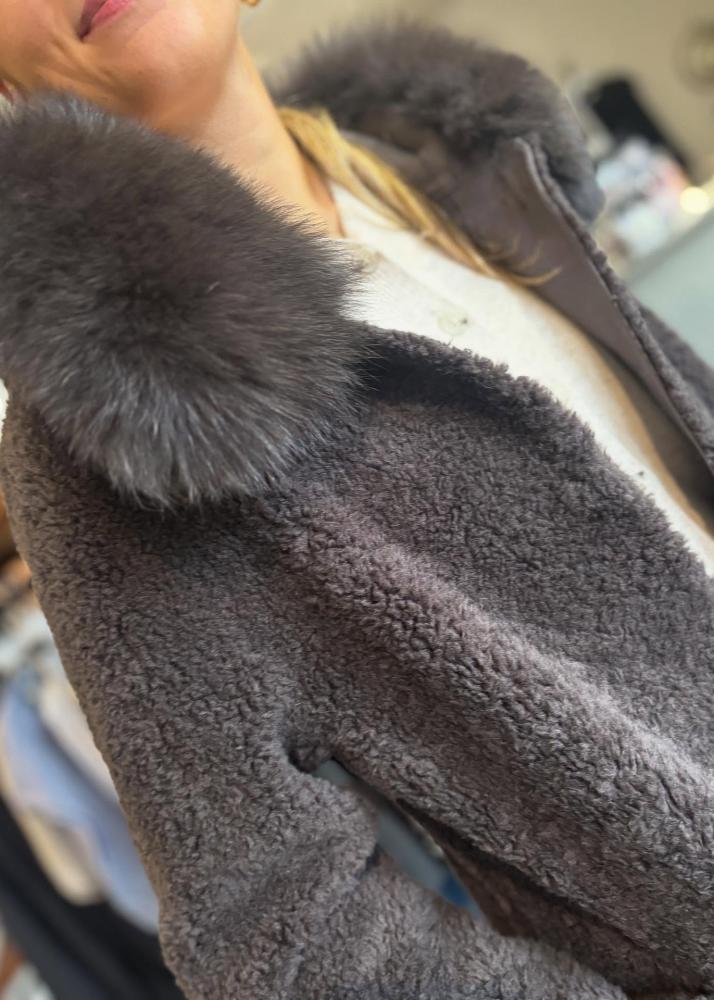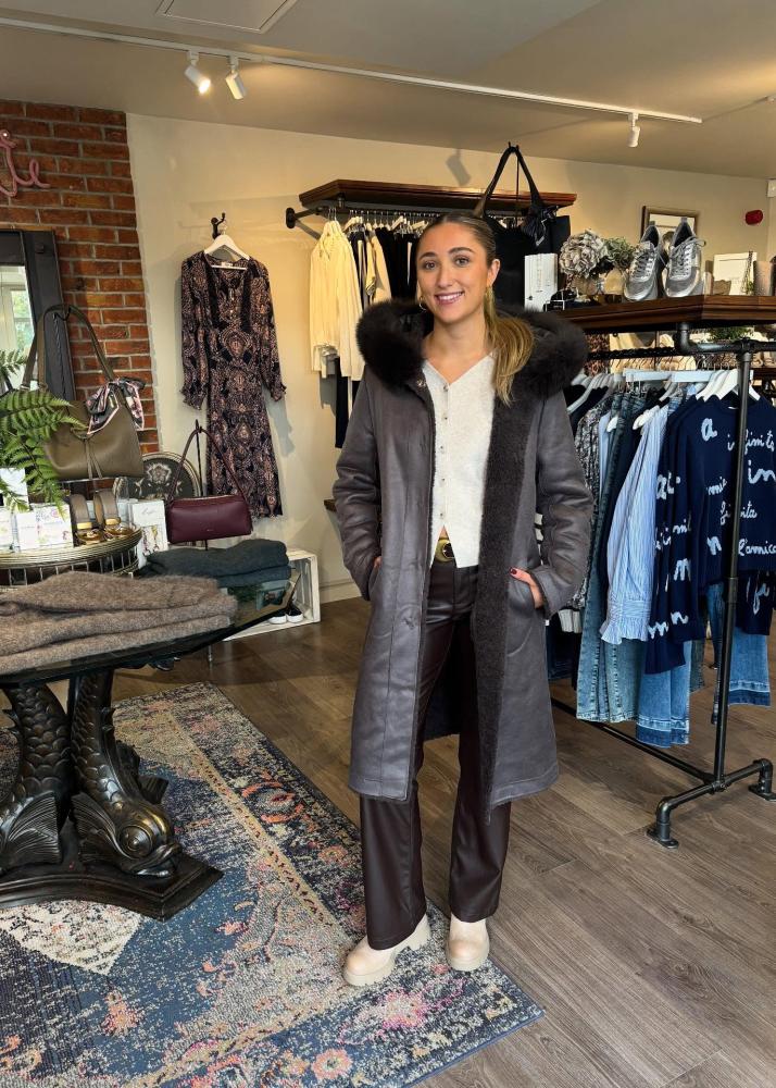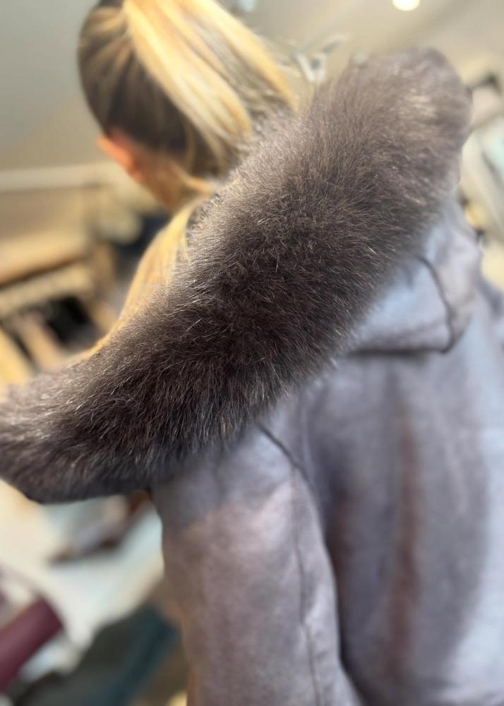Next we are showing the airwool sheepskin coat weaved with 100% lambswool and with the faux fur hood in brown, which can be worn both ways, with the smooth side or the wool side depending on your outfit. The coat is a classic cut with slimline tailoring, so no need for heavy sweaters underneath this stunning piece.