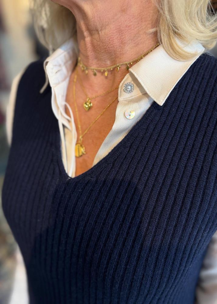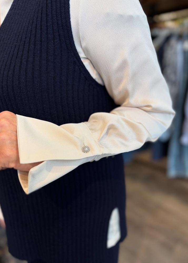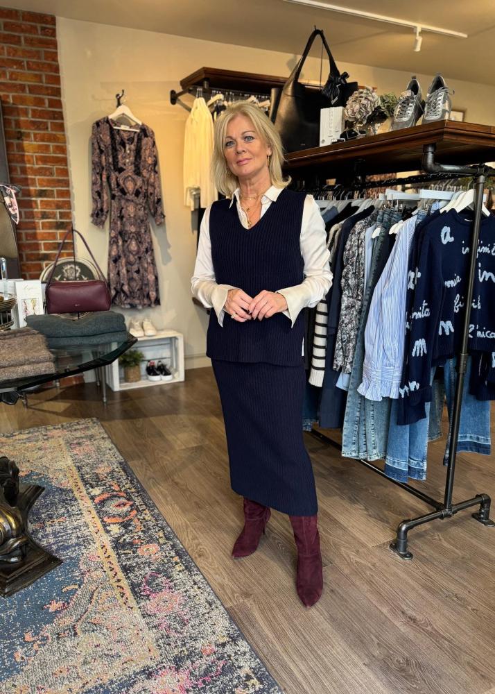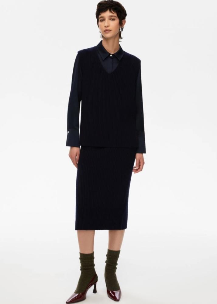Starting with the ribbed knit wool-blend vest - a relaxed V-neck fit with side slits that’s perfect for layering. We’ve paired it with the cream satin shirt, finished with statement wide cuffs and sparkling bejewelled buttons (also available in navy). On the bottom, Jo wears the matching ribbed knit wool-blend midi skirt, cut in a sleek pencil silhouette with an elasticated waist and side slit for ease and elegance.