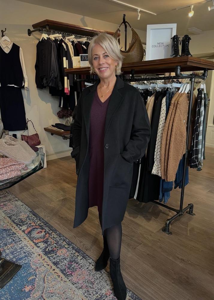 Mel has paired this dress with our black Rails wool coat and Paul Green ankle boots for a more timeless polished look.