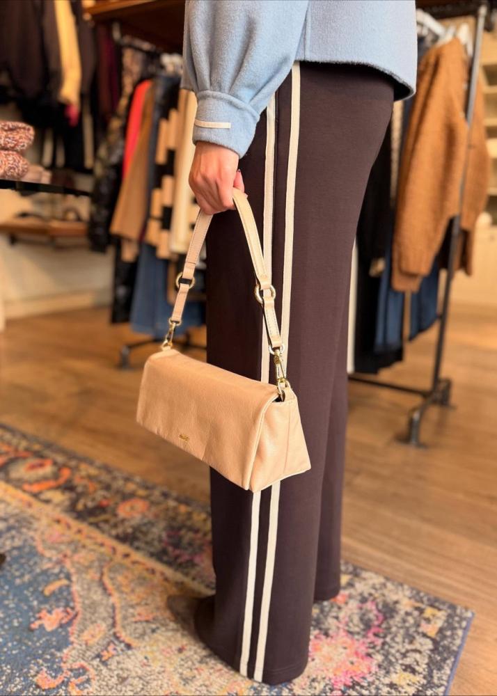 Today we have Dev & Charlotte wearing our chocolate brown trousers two ways - combining sporty style with effortless comfort. Crafted from a scuba and technical yarn blend, they feature a relaxed fit, straight leg, elastic waistband, and contrast side stripes for a sleek finish. A front pressed crease and practical pockets complete the look. Also available in classic black.