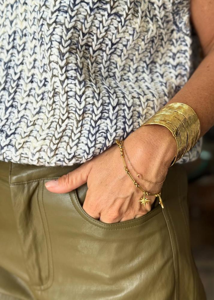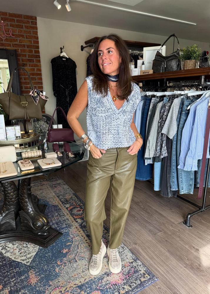 The vest features a classic deep V-neck in a soft knit with beautiful colours running through it of blue, white, and khaki. Its relaxed fit makes it versatile - wear it solo like Charlotte, or layer over a blouse, tee, or even a dress.