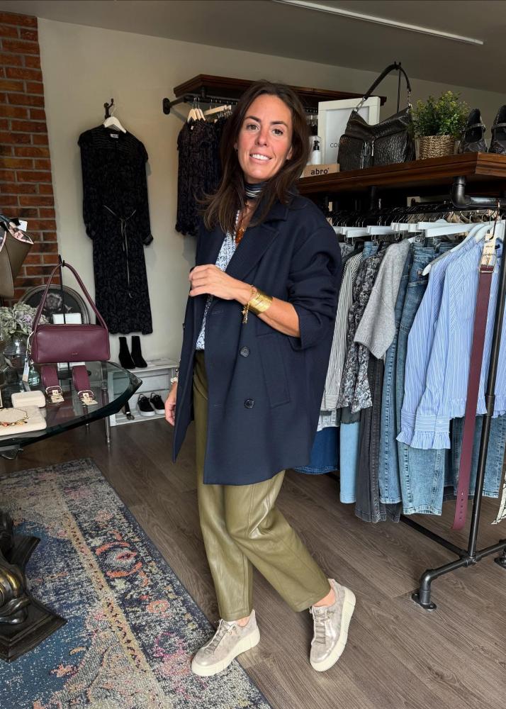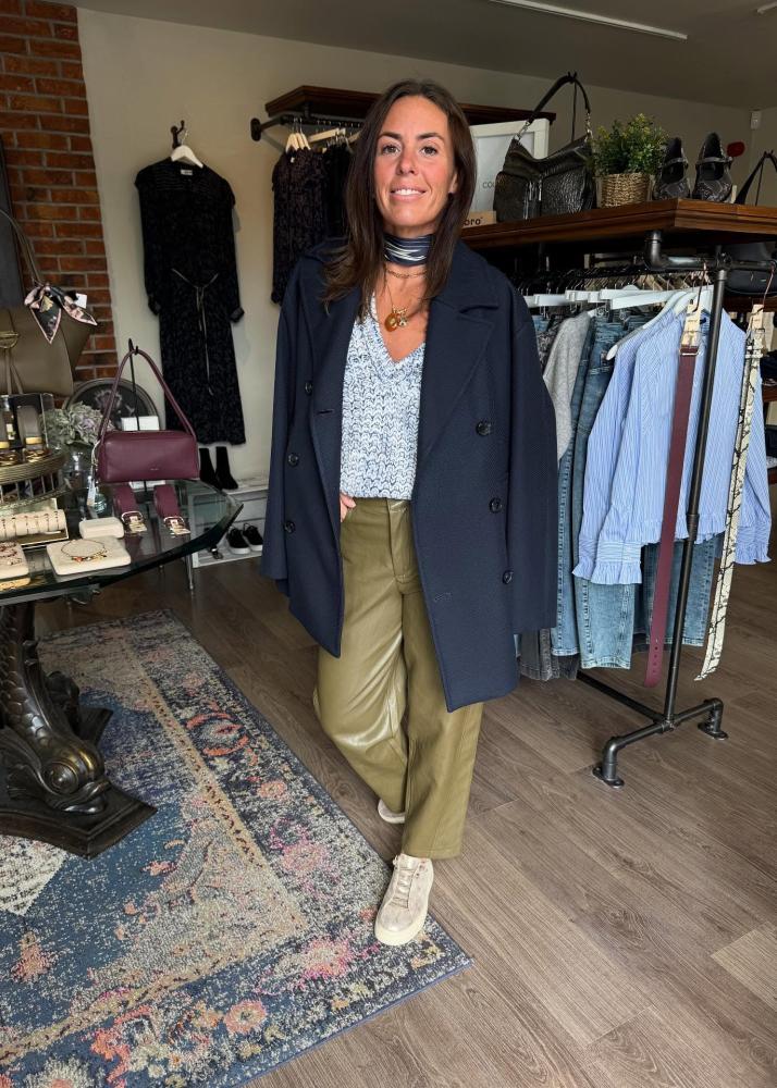 To layer up, we’ve added our iBlues double-breasted jacket in navy. With its oversized fit, lapel collar, and dropped shoulders, it’s the perfect tailored piece for a polished finish.