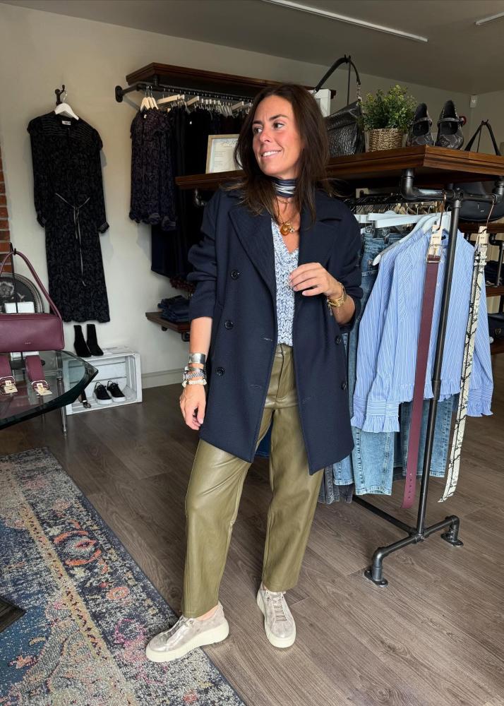 We’ve paired it with YAYA faux leather khaki trousers, designed with a flattering high waist, relaxed fit at the hips, and narrowing ankles. They also feature chic front slit pockets and seam detailing.
