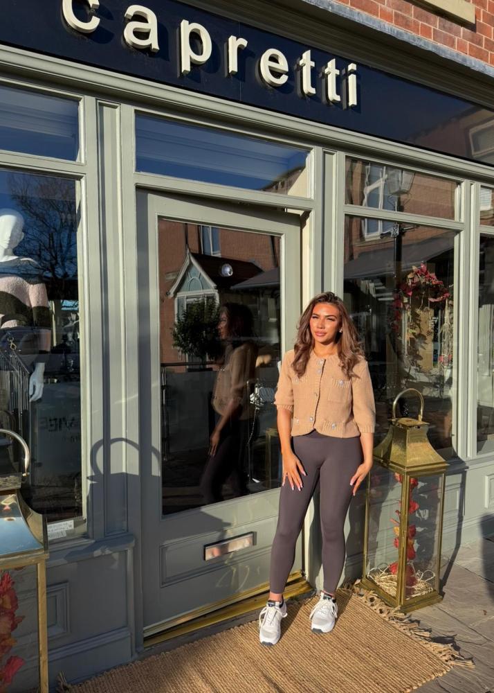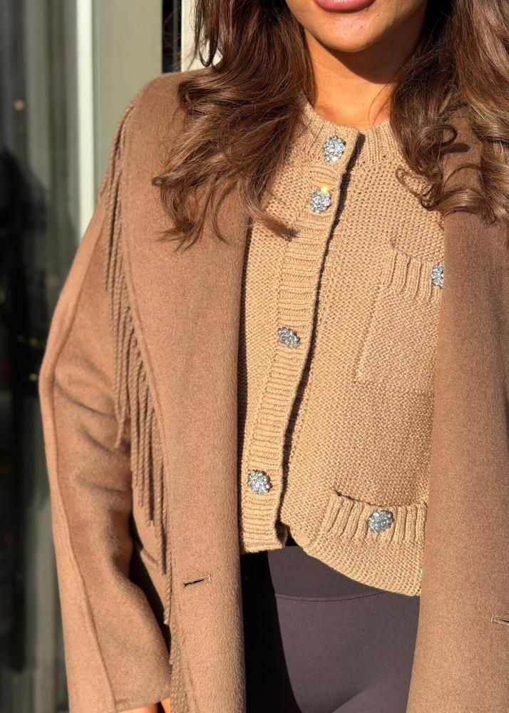 First we have the Oui camel knit cardigan, made from a cotton blend. Soft, elegant and with a hint of subtle sparkle. A statement knit that instantly elevates any outfit while still feeling effortlessly wearable. Available in sizes 36, 40 & 42.
