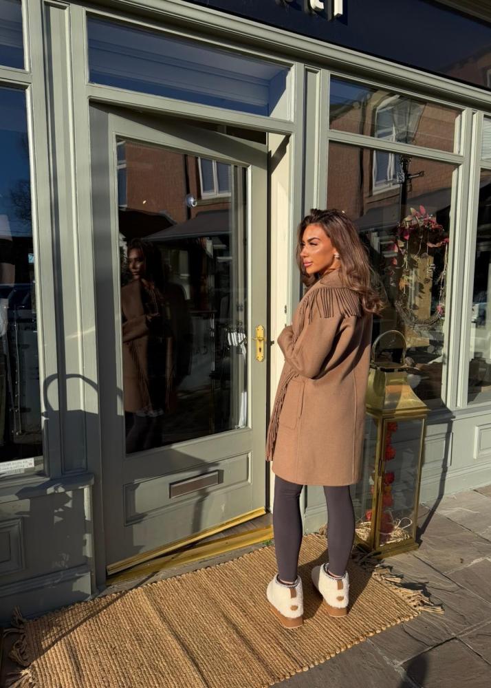 Next we have our Rails shawl coat, it’s a heavy wool blend, beautifully crafted with that signature laid-back charm. The fringe detailing adds movement and makes it the perfect layering piece for crisp, sunny days. Available in size XS.