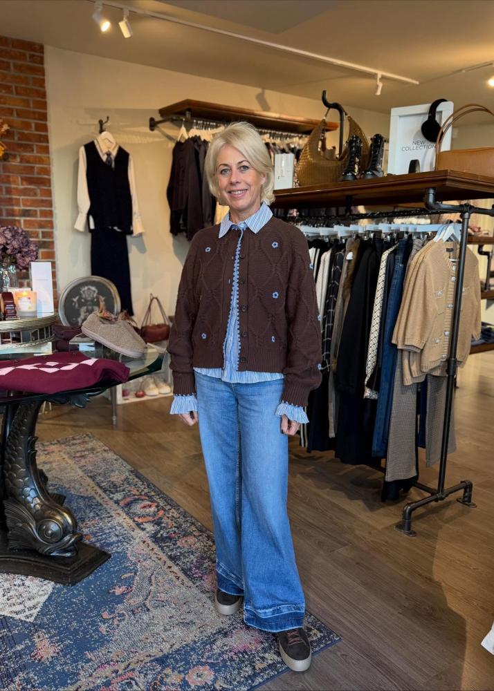 She’s wearing the Mos Mosh jeans we have remaining in just one size, and tying in perfectly with her cardigan are the classic Paul Green trainers in this season’s brown shade.